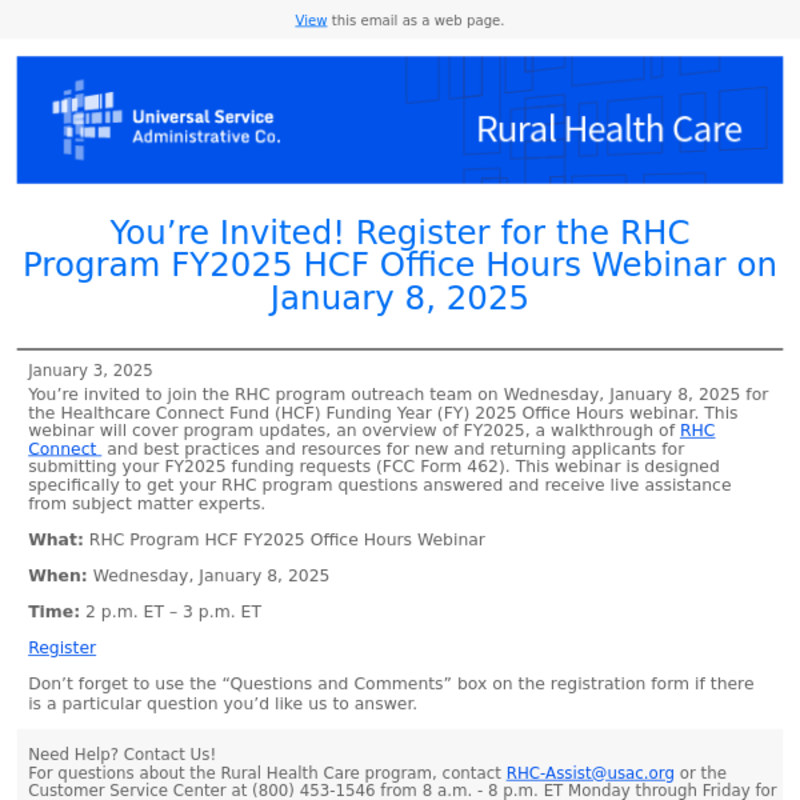 outreach team on Wednesday, January 8, 2025 for the Healthcare Connect Fund (HCF) Funding Year (FY) 2025 Office Hours webinar. This webinar