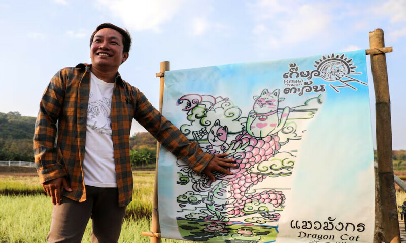 Thai rice fields transformed into vibrant art depicting red dragon, feline deity