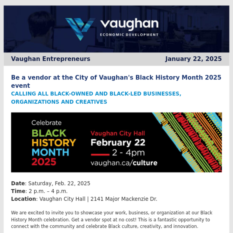 Be a vendor at the City of Vaughan's Black History Month event, VBEC January and February group consultations, & More Business News